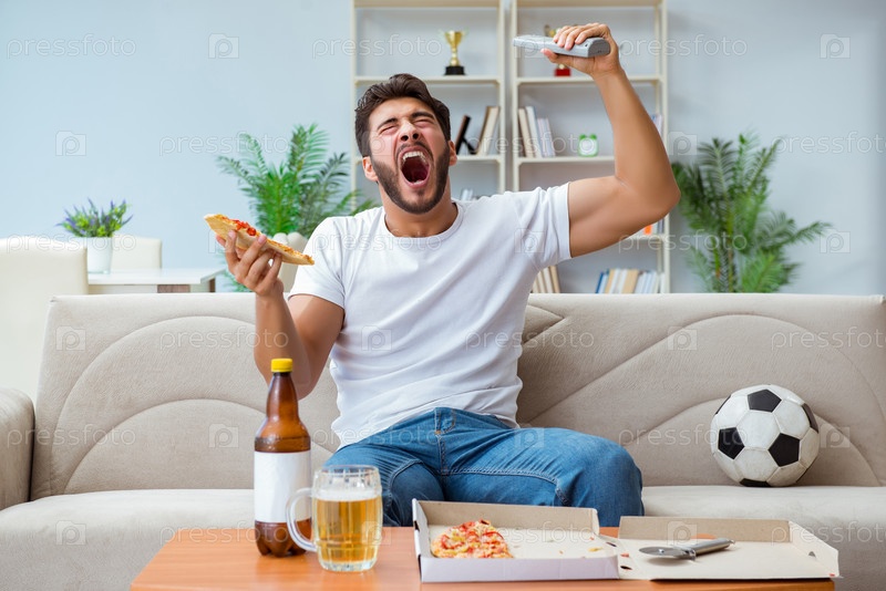 Человек ест пиццу с пивом