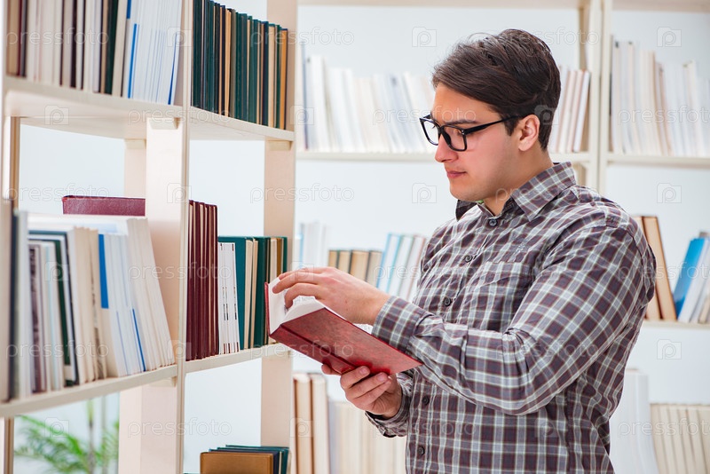 Молодой студент ищет книги в библиотеке колледжа