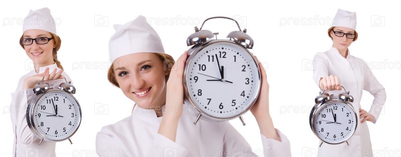Привлекательная женщина-врач с большими часами на белом