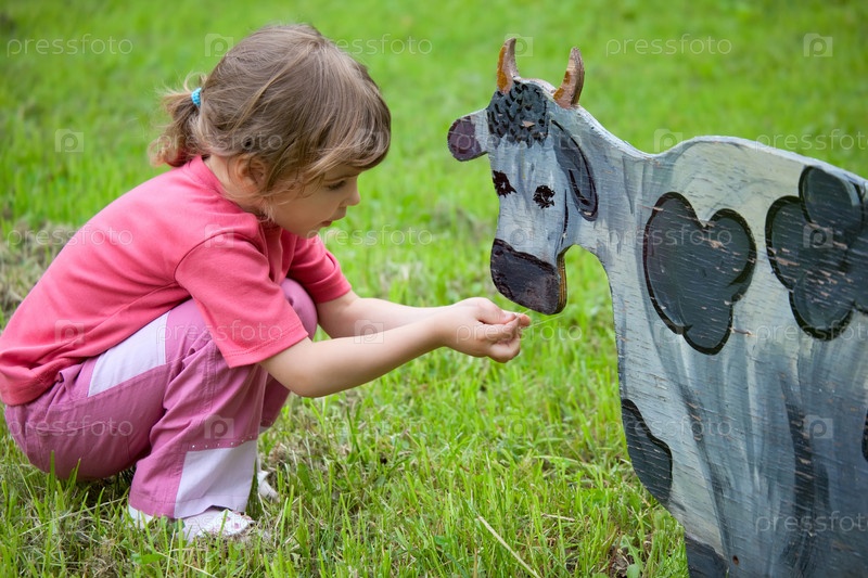 Девочка кормит деревянную корову