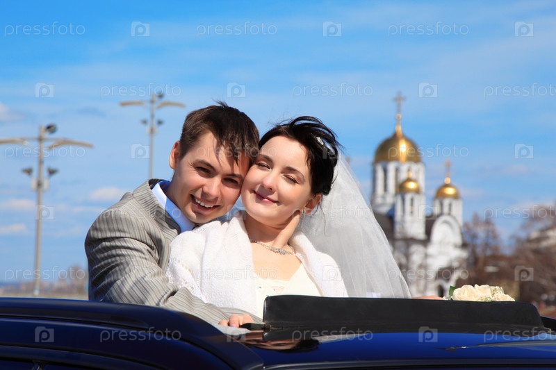 Счастливые жених и невеста на фоне церкви
