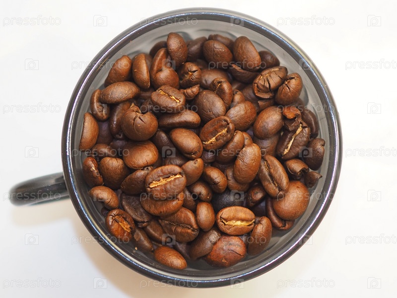 Кофейные зерна в чашке на белом фоне