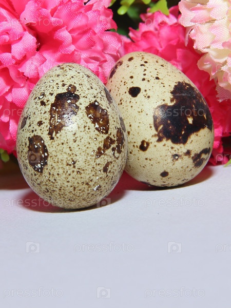 Два перепелиных яйца на фоне розовых цветов
