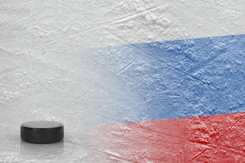 Хоккейная шайба и флаг России на льду