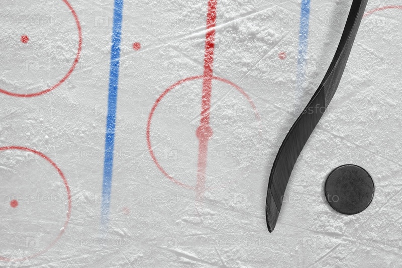 Клюшка, шайба и фрагмент хоккейной арены с разметкой