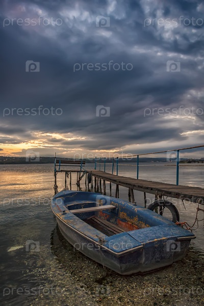 Спокойный закат в гавани с лодкой