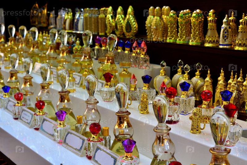 Флаконы с женскими духами на рынке в Объединенных Арабских Эмиратах