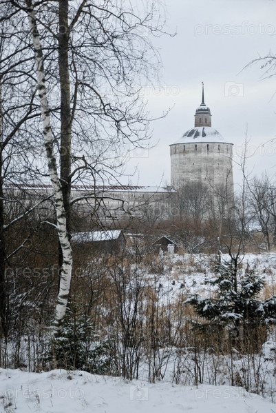 Зимний пейзаж. Край леса на фоне башни древнего монастыря. Россия