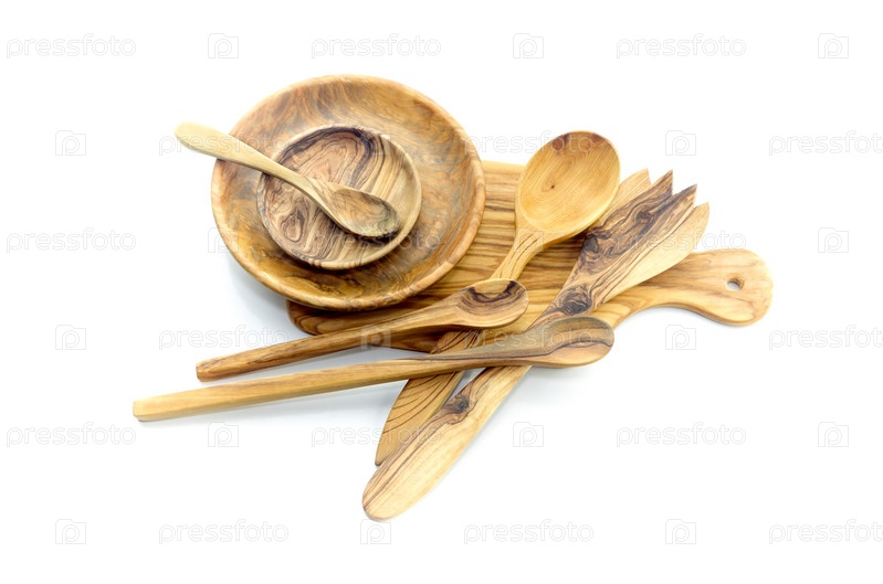 Деревянная посуда на белом фоне