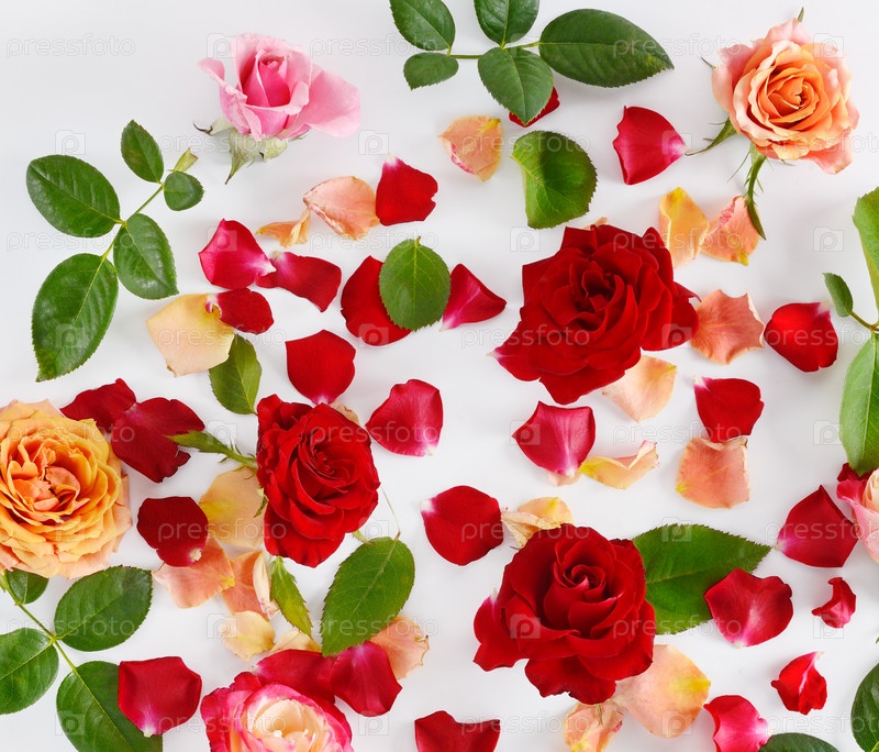 Красные розы и лепестки на белом фоне