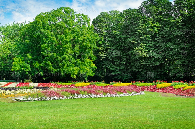 Летний парк с красивыми клумбами