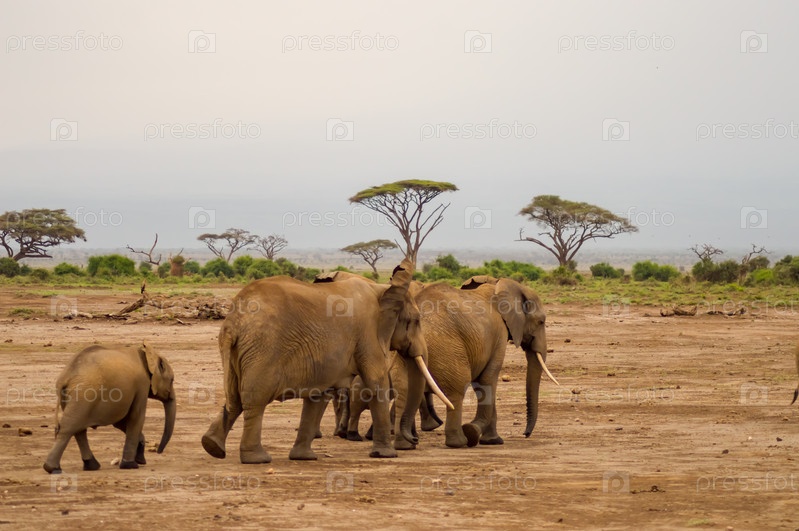 Слон с его детенышем в саванне Амбосели парка в Кении
