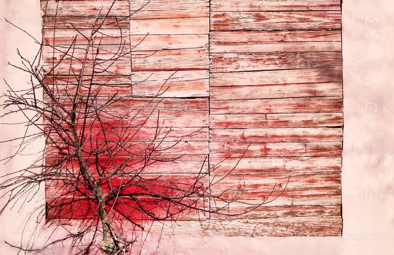 Красный и розовый фон стены и высушенного дерева