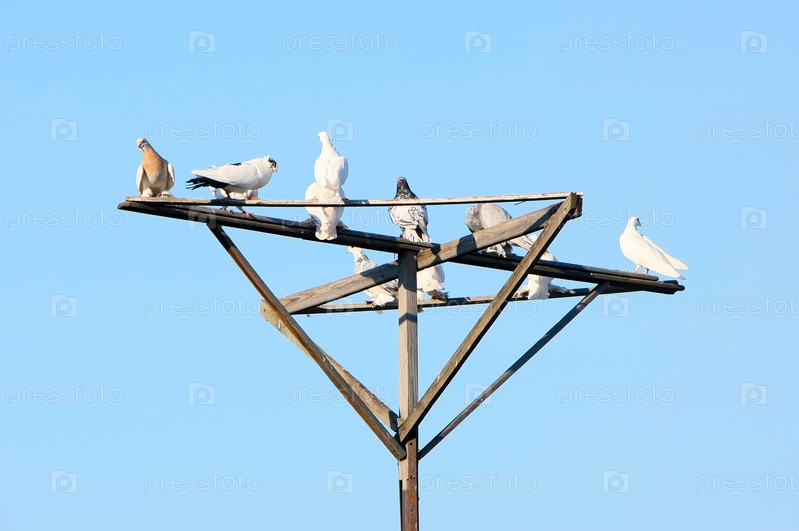 Много голубей на деревянном столбе