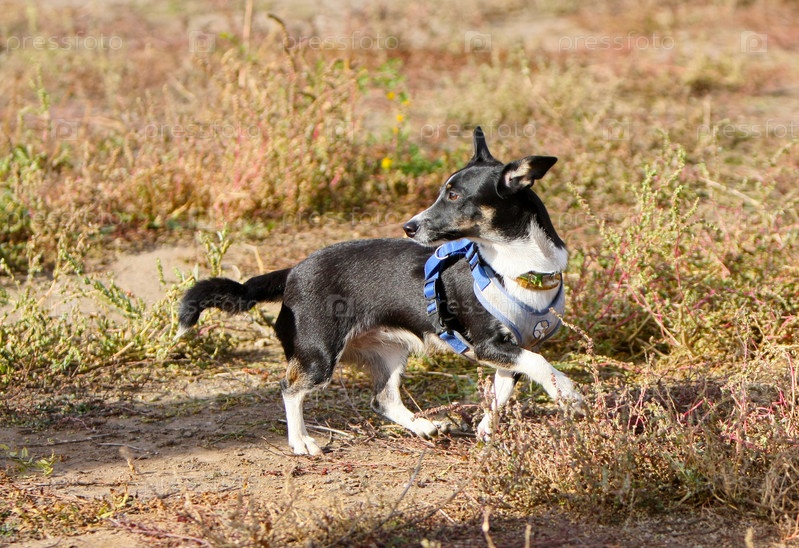 Черно-белая собака гуляет по сухой траве
