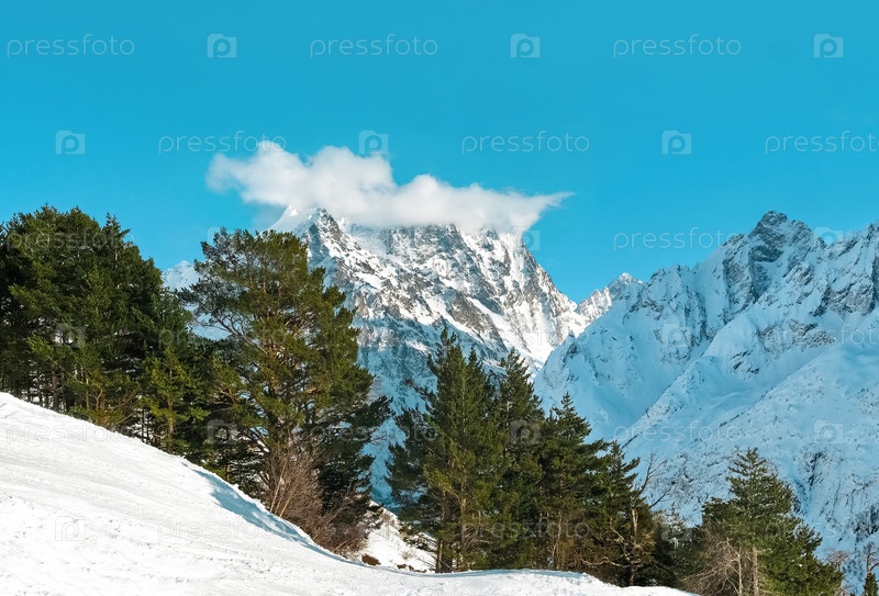 Панорама Кавказских скалистых гор в облаках на Домбае