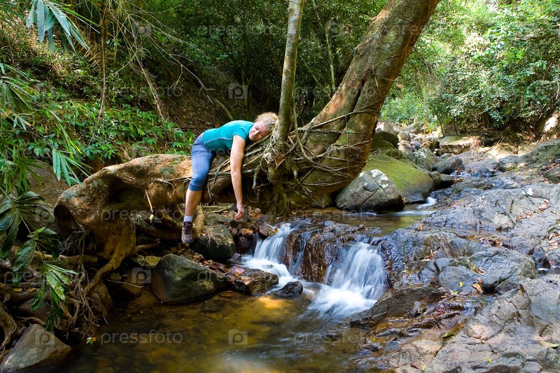 Женщина лежит на стволе дерева