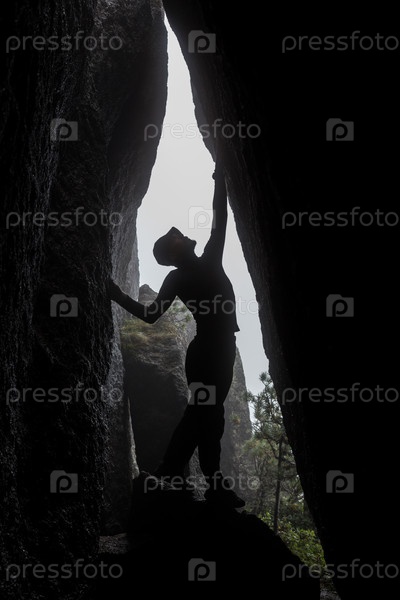 Человек стоит между скалами