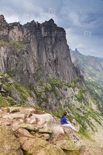 Молодая женщина, сидя на скале