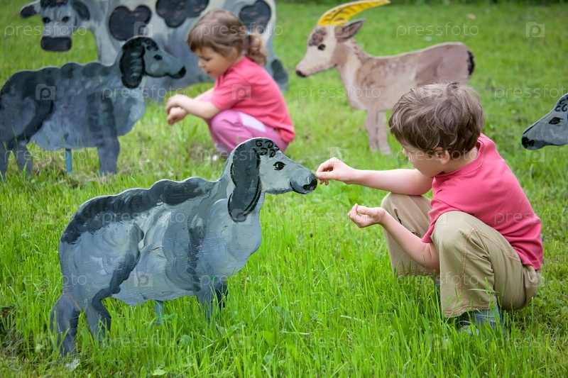 Дети кормят деревянного коня