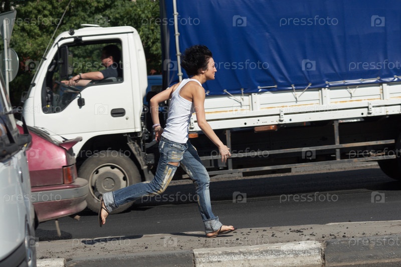 Девушка бежит по дороге среди автомобилей