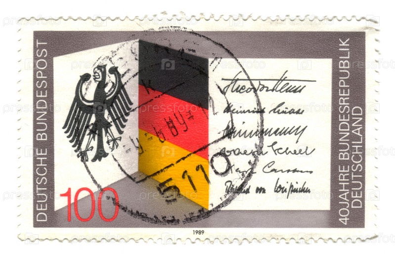 Маока Германии 1989 года, посвященная 40-летию Федеративной Республики Германии, показывает национальный флаг, герб и подписи президентов