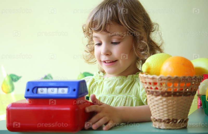Улыбающаяся девочка играет в магазин