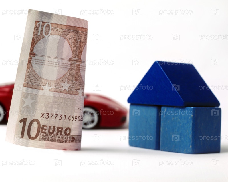 Десять евро и красный автомобиль на белом фоне