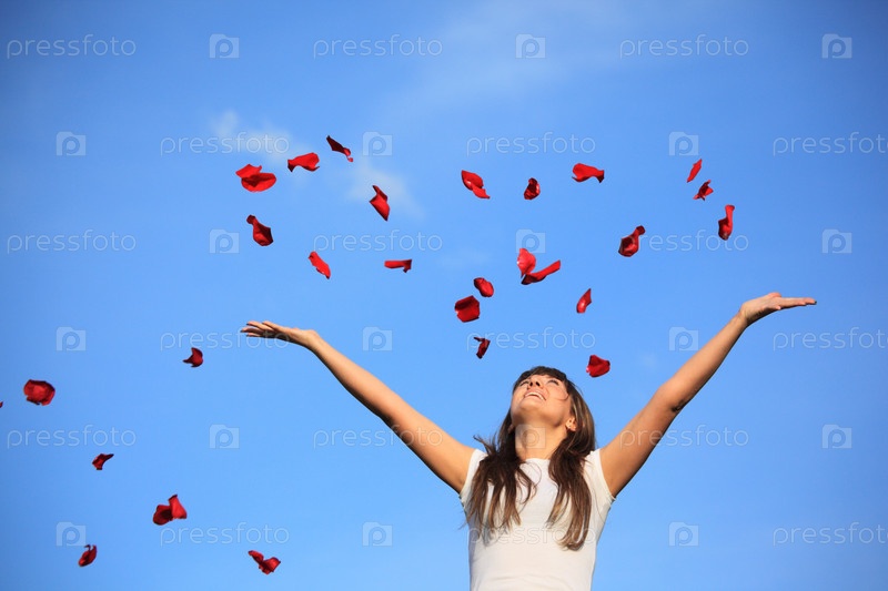 Девушка разбрасывает лепестки роз