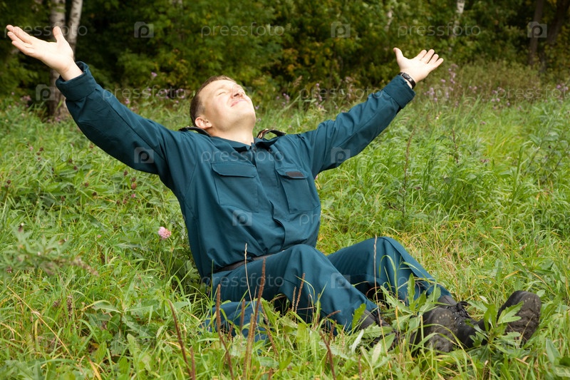 Военный человек,сидящий на поляне с распростертыми руками