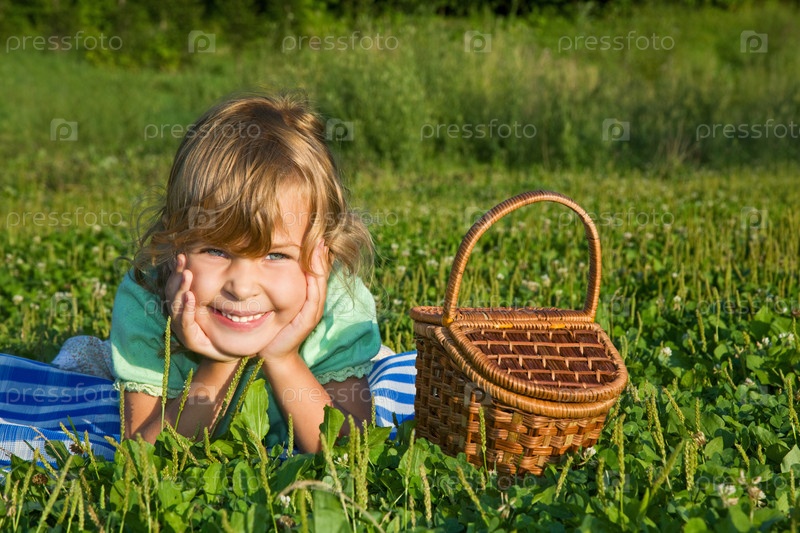 Улыбающаяся девочка с корзинкой на поляне