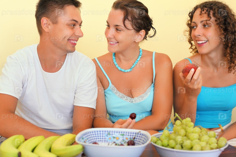 Мужчина и две молодые женщины едят фрукты в уютной комнате