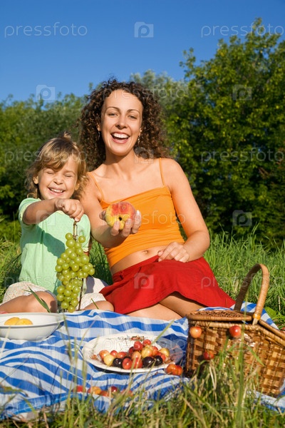 Дочка с мамой сидят на покрывале с фруктами
