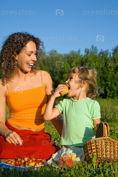 Дочка с мамой едят фрукты на пикнике