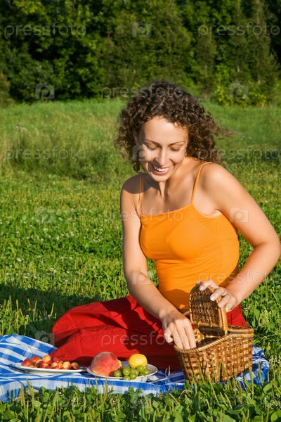 Молодая женщина достает фрукты из корзины на пикнике