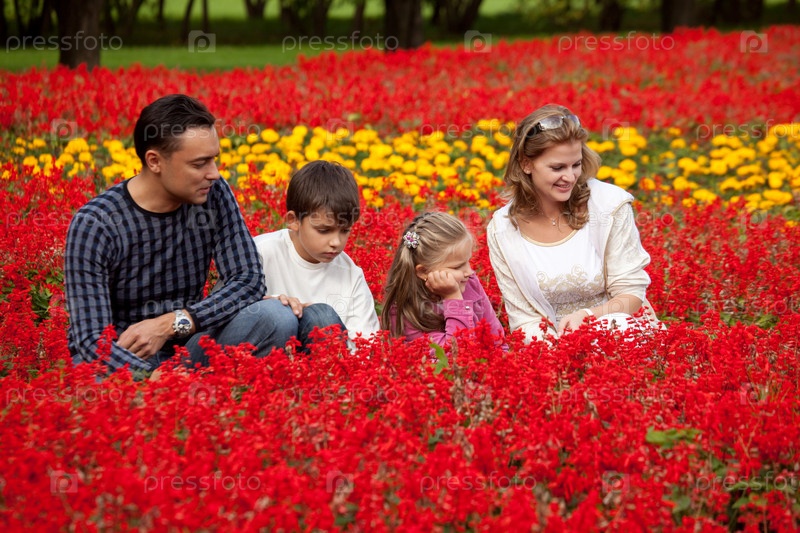 Семья из четырех человек смотрит на цветы в парке