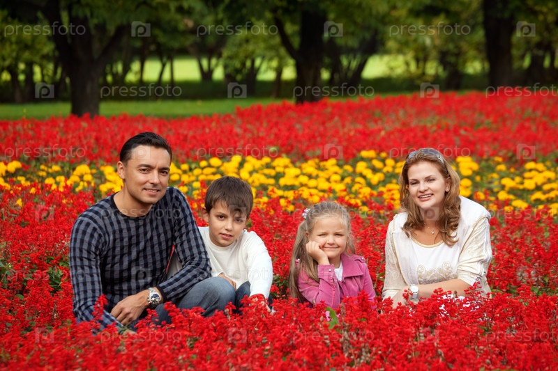 Семья из четырех человек в цветущем парке