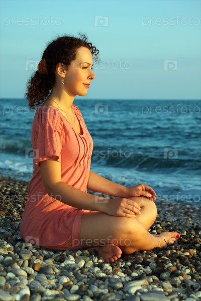 Красивая девушка медетирует на берегу моря