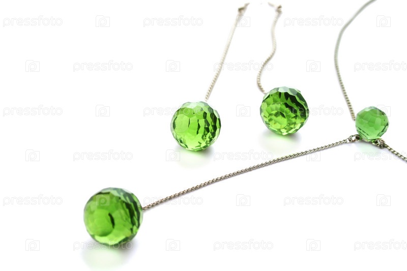 Колье и серьги с прозрачными зелеными шариками, изолированные на белом фоне