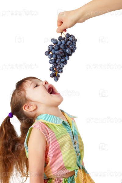 Девочка ловит ртом виноград на белом фоне