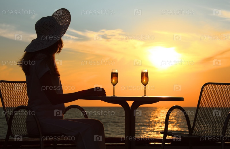 Женщина за столом с двумя бокалами вина на фоне заката