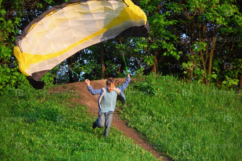 Мальчик начинает летать, используя парашют