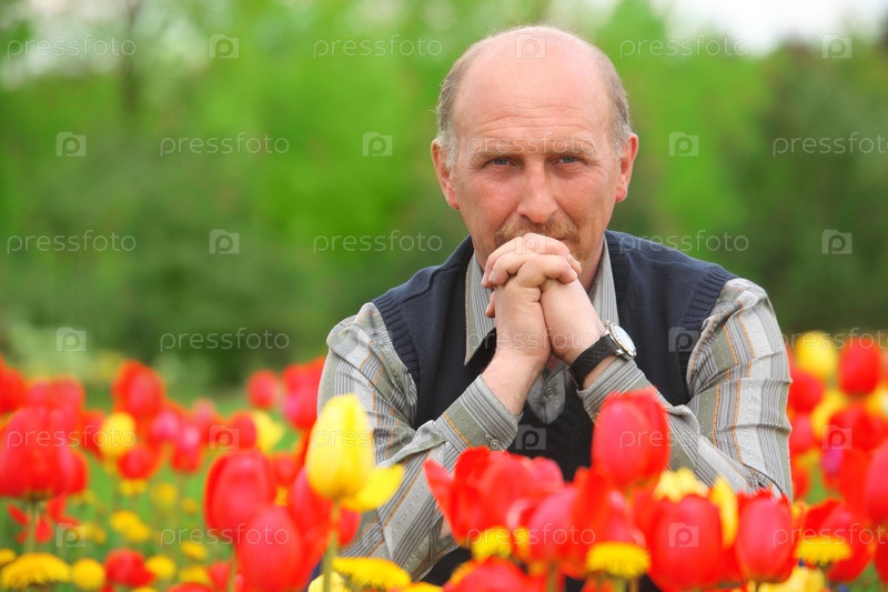 Взрослый мужчина сидит в поле тюльпанов