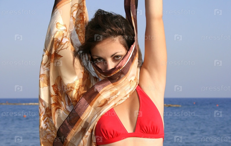 Девушка в красном купальнике у моря
