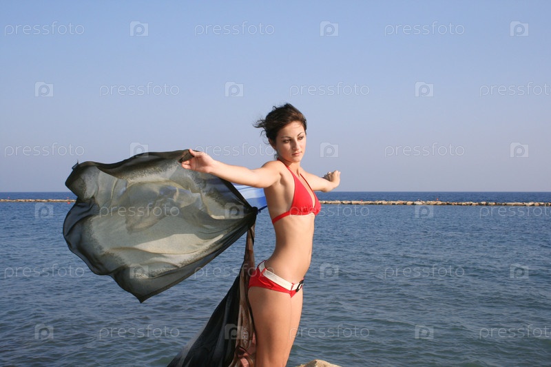 Красивая девушка в красном купальнике у моря