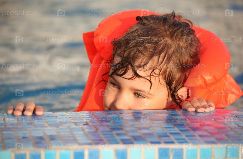 Маленькая девочка в надувном жилете в бассейне