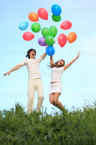 Молодая пара прыгает с разноцветными воздушными шарами