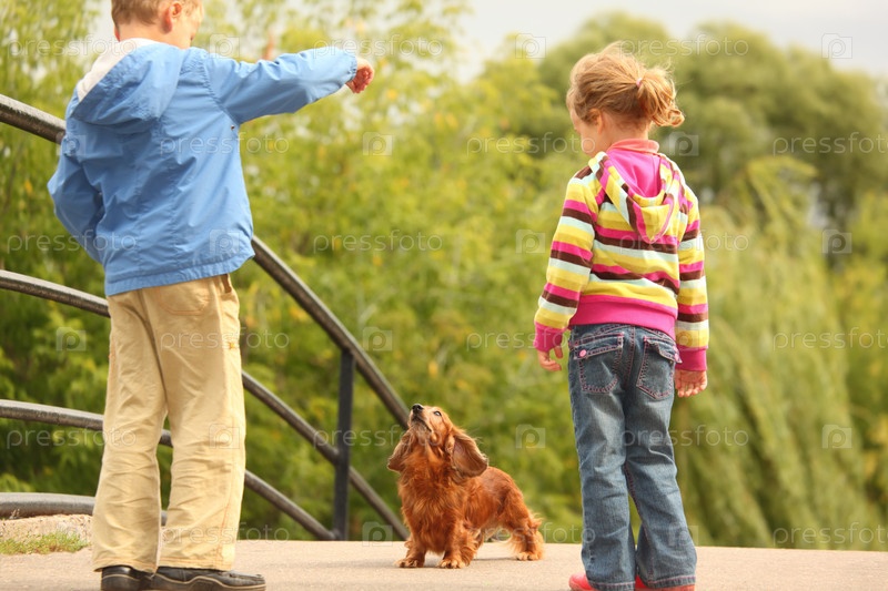 Дети с таксой на открытом воздухе