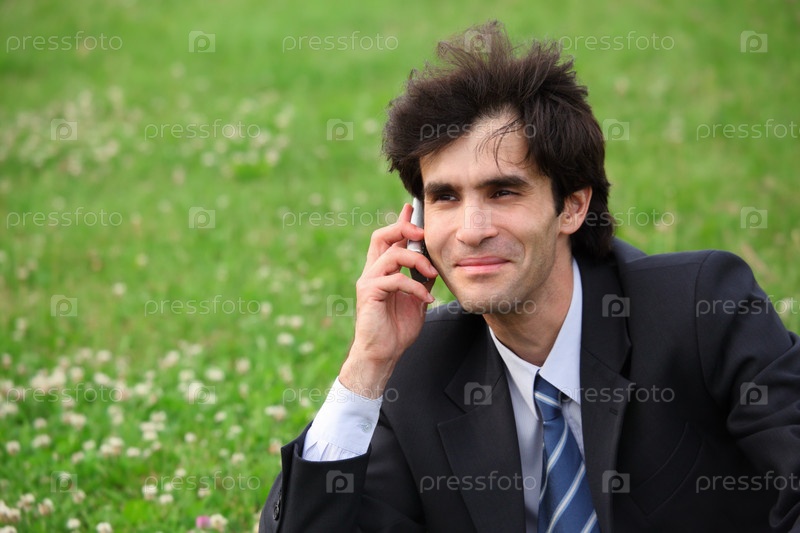 Бизнесмен сидит на поляне и говорит по мобильному