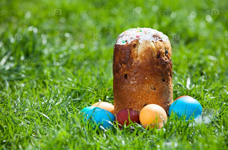 Пасхальный кулич и крашеные яйца на траве